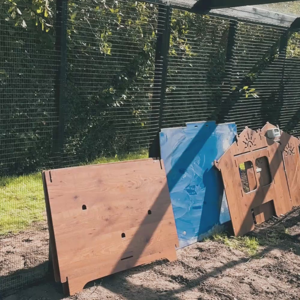 - HPL pladerne, som hønsehuset er fremstillet af bliver rengjort ved at bruge vand, evt. en haveslange med vandstråle og/eller et hvilket som helst almindeligt rengøringsprodukt (træhytter bliver let fyldt med dårlig lugt og er permanent snavsede efter kort tid)
