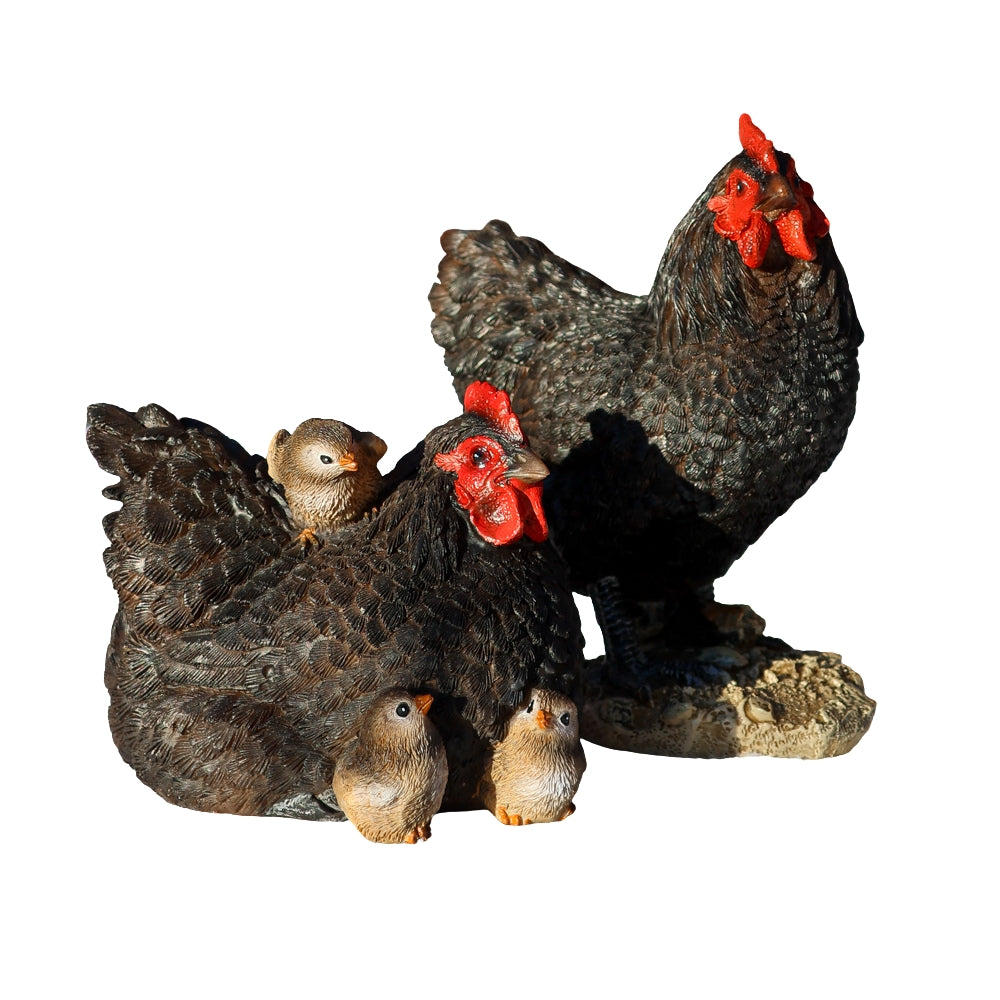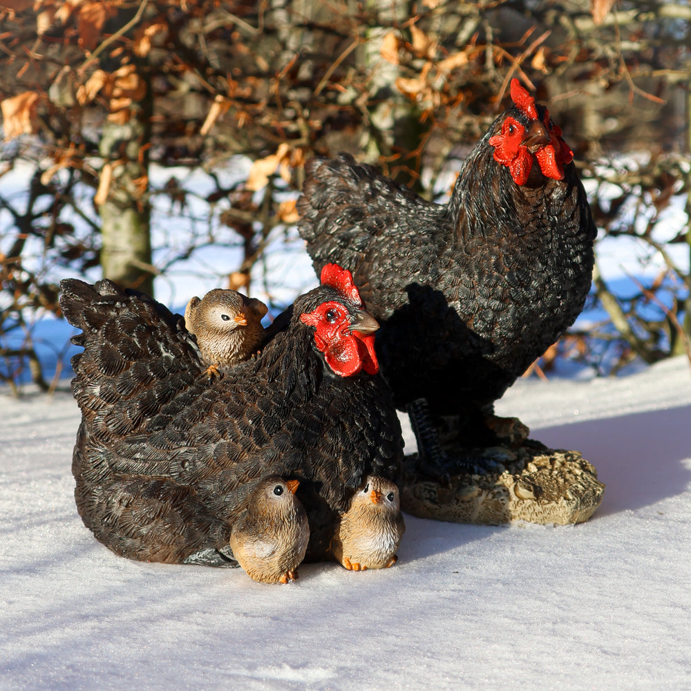 Skab ægte forårsstemning med denne charmerende hønsefamilie bestående af en stolt hanefar, en hønemor og 3 søde kyllinger. Figuren er fremstillet i polyresin, som gør den både holdbar og velegnet til pynt både inde og ude.