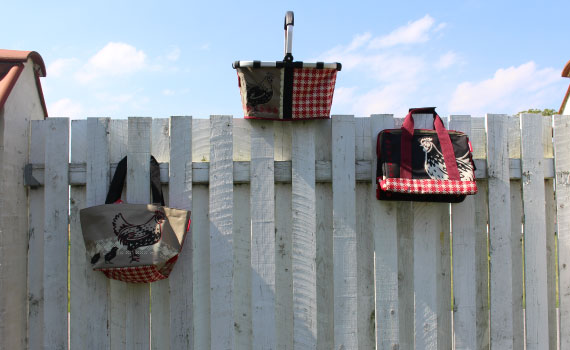 Du kan også få indkøbsposer i stof og med de fineste hønsemotiver.