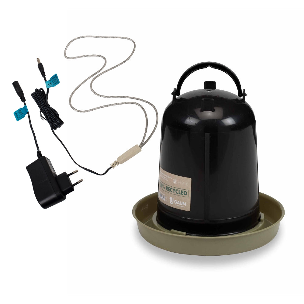 Du får her en genbrugsvandautomat på 3 L samt det populære varmekabel på 10 watt. En duo som hjælper med at holde hønsenes vand frostfrit vinteren igennem. Da vandautomaten er af genbrugsplast, er farverne på billedet kun vejledende.