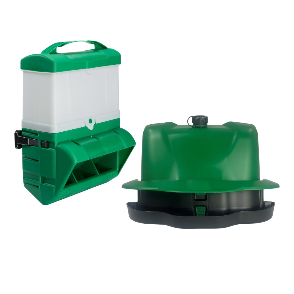 Med dette sæt vil du med 5 høns i haven cirka have mad til cirka 13 dage og frisk vand til 8 dage. Perfekt for det mindre til mellemstore hønsehold.